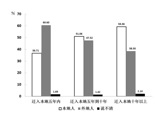 B、隨著遷入年限的增加,有越來越多的沒有當?shù)貞艨诘耐鈦砣藛T不知道自己到底是屬于本地人還是屬于外地人