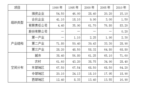 中國私營企業(yè)的組織類型、產業(yè)結構和空間分布(1990—2010年)(單位:%)