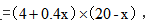 因此本題所求為一元二次函數(shù)的最大值。通過列式可知,分別使得4+0.4x和20-x等于0,可以解得函數(shù)的兩個(gè)根為