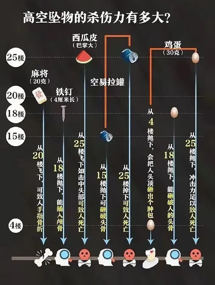 結合常見案例,有人總結了7種最危險的高空拋棄物情形,分別是:1.煙頭:未滅的煙頭落入易燃物中,極可能引發(fā)火災;2.菜刀:刀具下墜,如遇上人體,后果不堪設想;3.啤酒瓶:啤酒瓶高空著地后會產生爆裂、碎開,碎片飛濺;4.花盆:花盆砸到路上,輕則嚇人,重則致命;5.磚石:輕則致傷,重則致命;6.爆竹:輕則讓途人受到驚嚇,重則引發(fā)火災、傷害幼童;7.晾衣桿:晾衣竿帶著金屬彎鉤,彎鉤如襲入人體特別是頭部,將造成致命威脅。