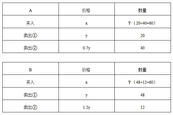 B的利潤(rùn)是A的3倍,可得:48y+1.2y×12-60x=(20y+0.7y×40-60x)×3;化簡(jiǎn)整理得120x=81.6y,則所求x/y=0.68。答案選B。