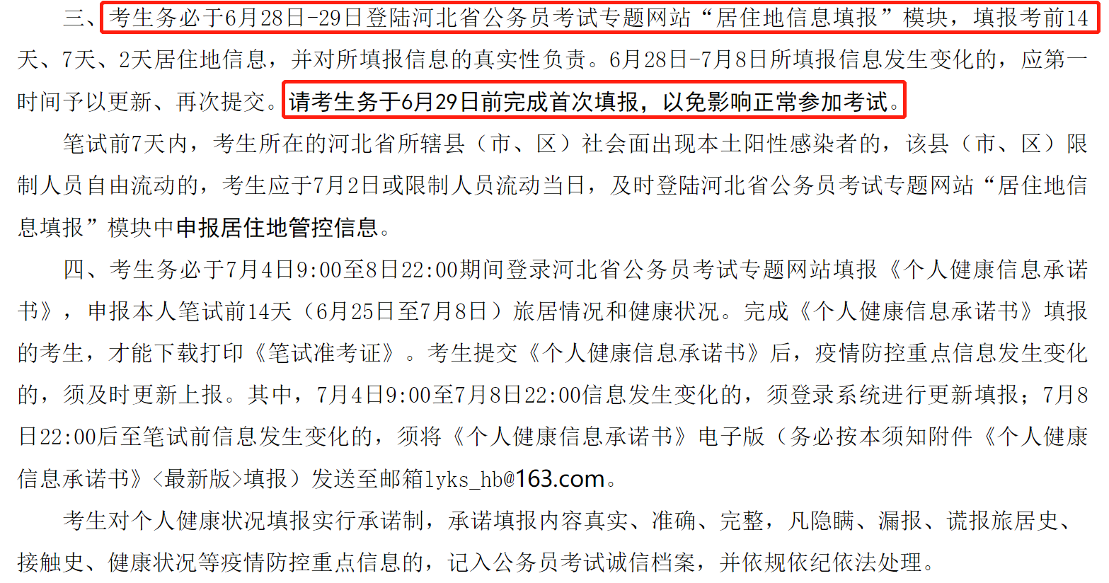 提醒:考生務(wù)必于6月28日-29日登陸河北省公務(wù)員考試專題網(wǎng)站“居住地信息填報(bào)”模塊,填報(bào)考前14天、7天、2天居住地信息,并對(duì)所填報(bào)信息的真實(shí)性負(fù)責(zé)。6月28日-7月8日所填報(bào)信息發(fā)生變化的,應(yīng)第一時(shí)間予以更新、再次提交。請(qǐng)考生務(wù)于6月29日前完成首次填報(bào),以免影響正常參加考試。
