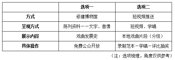 圍繞選項一與選項二進行對比,可發(fā)現選項一滿足:覆蓋面廣、群眾參與免費成本低等優(yōu)點,而博物館的展覽在參觀、體驗的門檻上要求相對較高,需要一定的戲曲基本知識;修建博物館成本更高;傳播集中于本地居民,而后逐步外移。