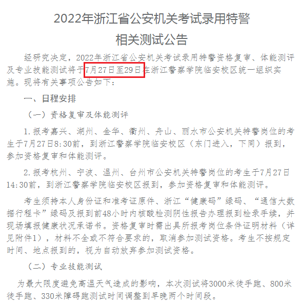 報考2022年浙江省考特警崗位的考生注意,官方已經(jīng)發(fā)布《2022年浙江省公安機(jī)關(guān)考試錄用特警相關(guān)測試公告》,資格復(fù)審、體能測評及專業(yè)技能測試將于7月27日-29日進(jìn)行。如下: