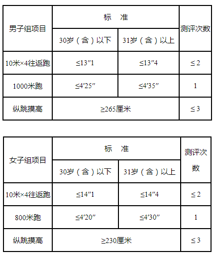 2.結(jié)果判定??忌枰淮涡酝ㄟ^三項(xiàng)測(cè)評(píng)方為體能測(cè)評(píng)合格,其中:10米×4往返跑測(cè)評(píng)不超過2次、縱跳摸高測(cè)評(píng)不超過3次、長跑測(cè)評(píng)1次;凡其中一項(xiàng)在規(guī)定測(cè)評(píng)次數(shù)內(nèi)未達(dá)標(biāo)的,不再進(jìn)行后續(xù)項(xiàng)目測(cè)評(píng),體能測(cè)評(píng)結(jié)果為不合格。