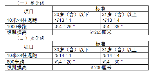 體能測評要求每項(xiàng)都必須合格,若有一項(xiàng)測評不合格,則體能測評總成績不合格。
